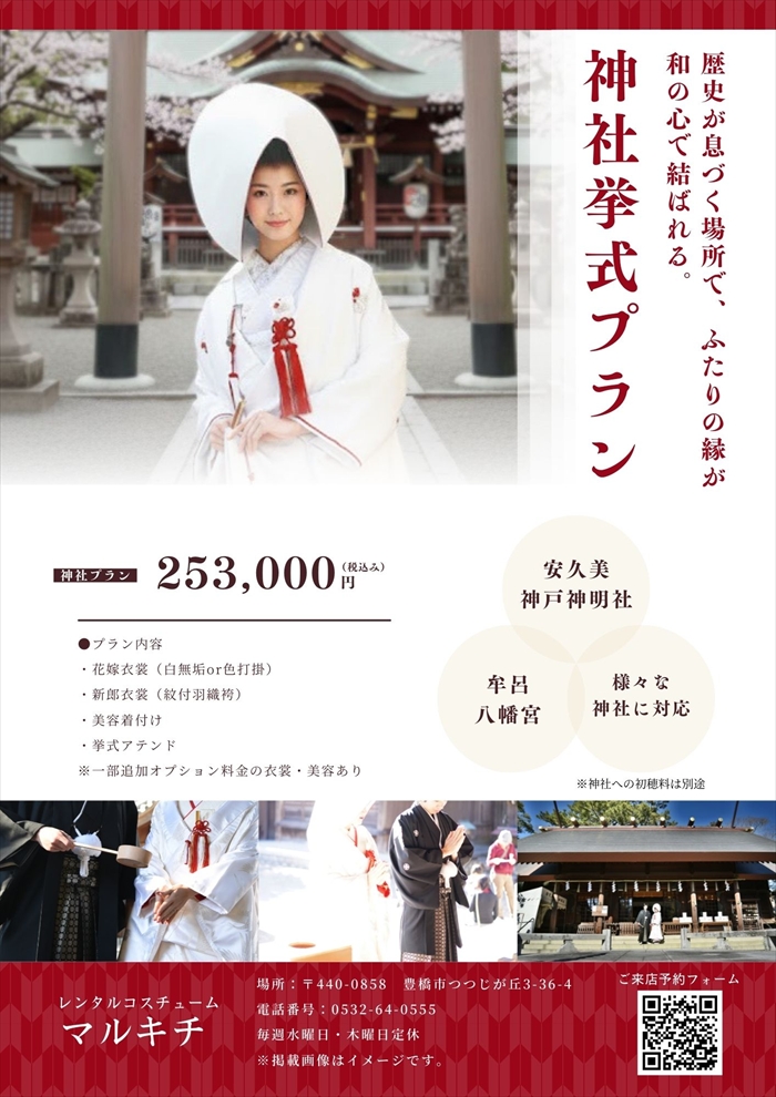 神社挙式をご希望の方に、貸衣裳・美容がセットになってお得なプランのご案内